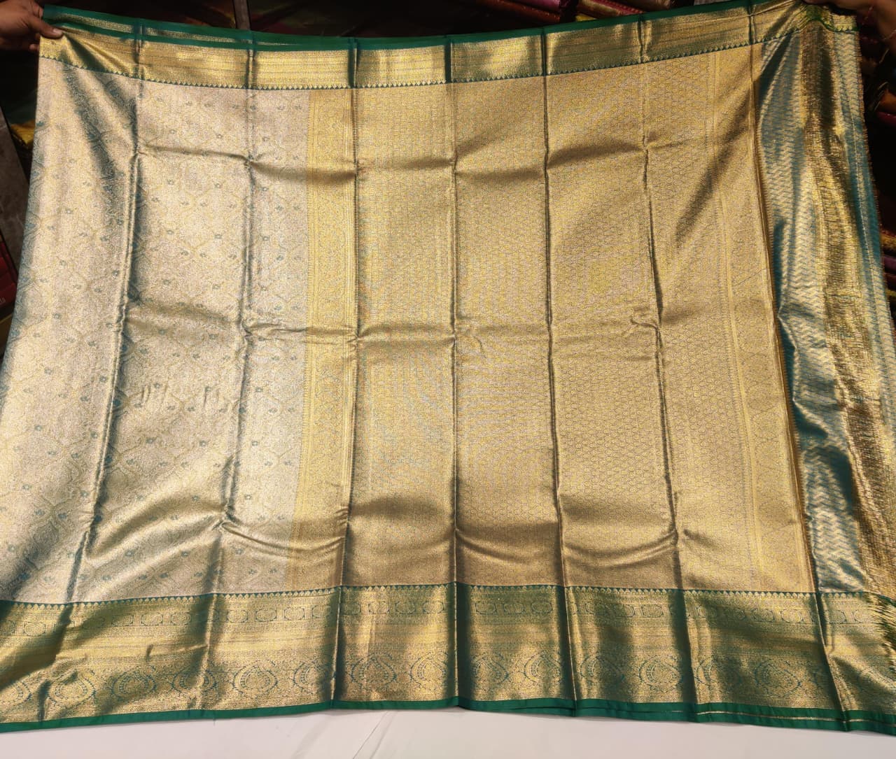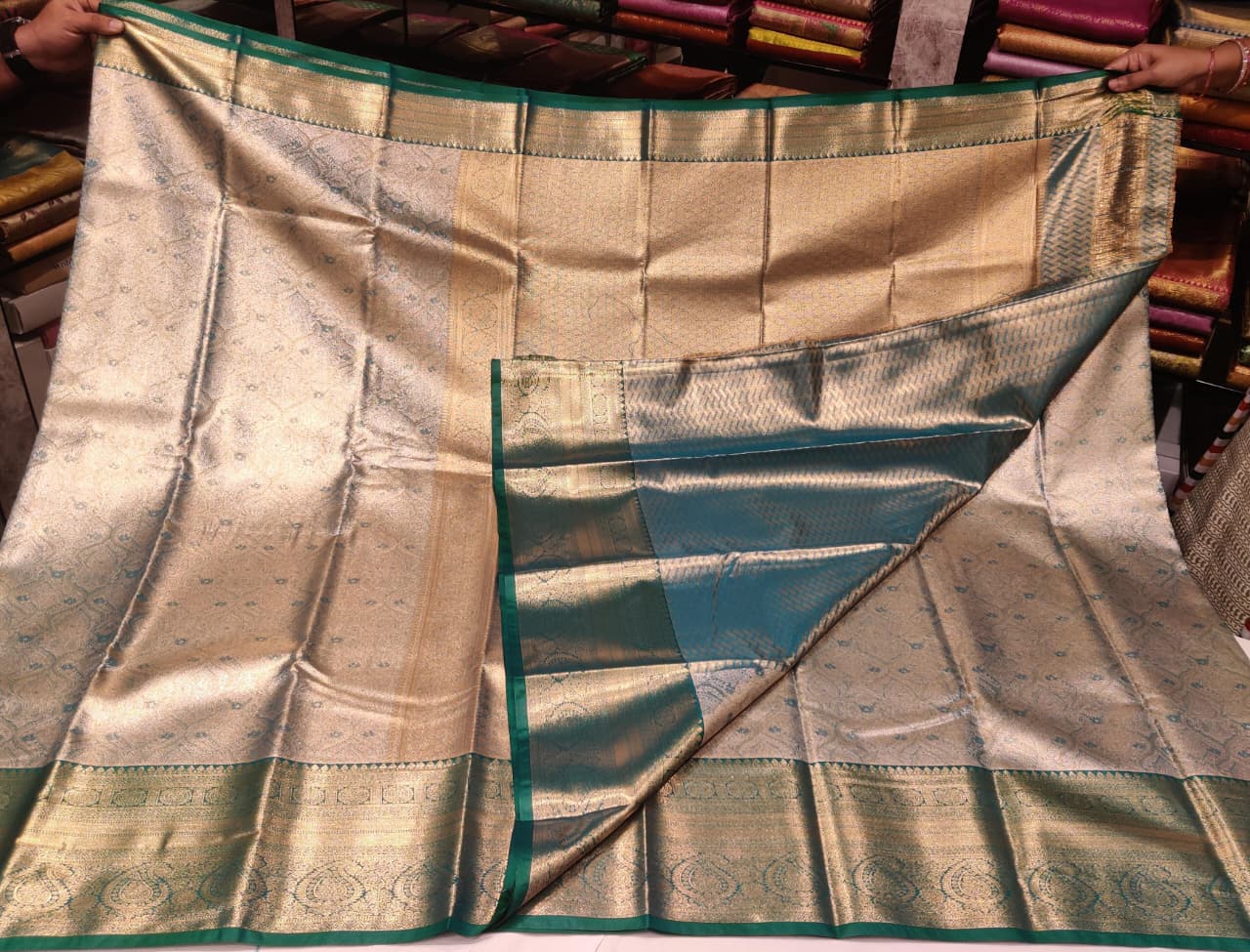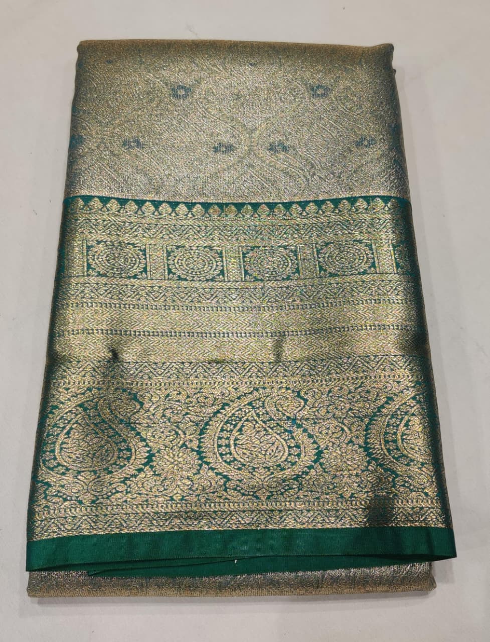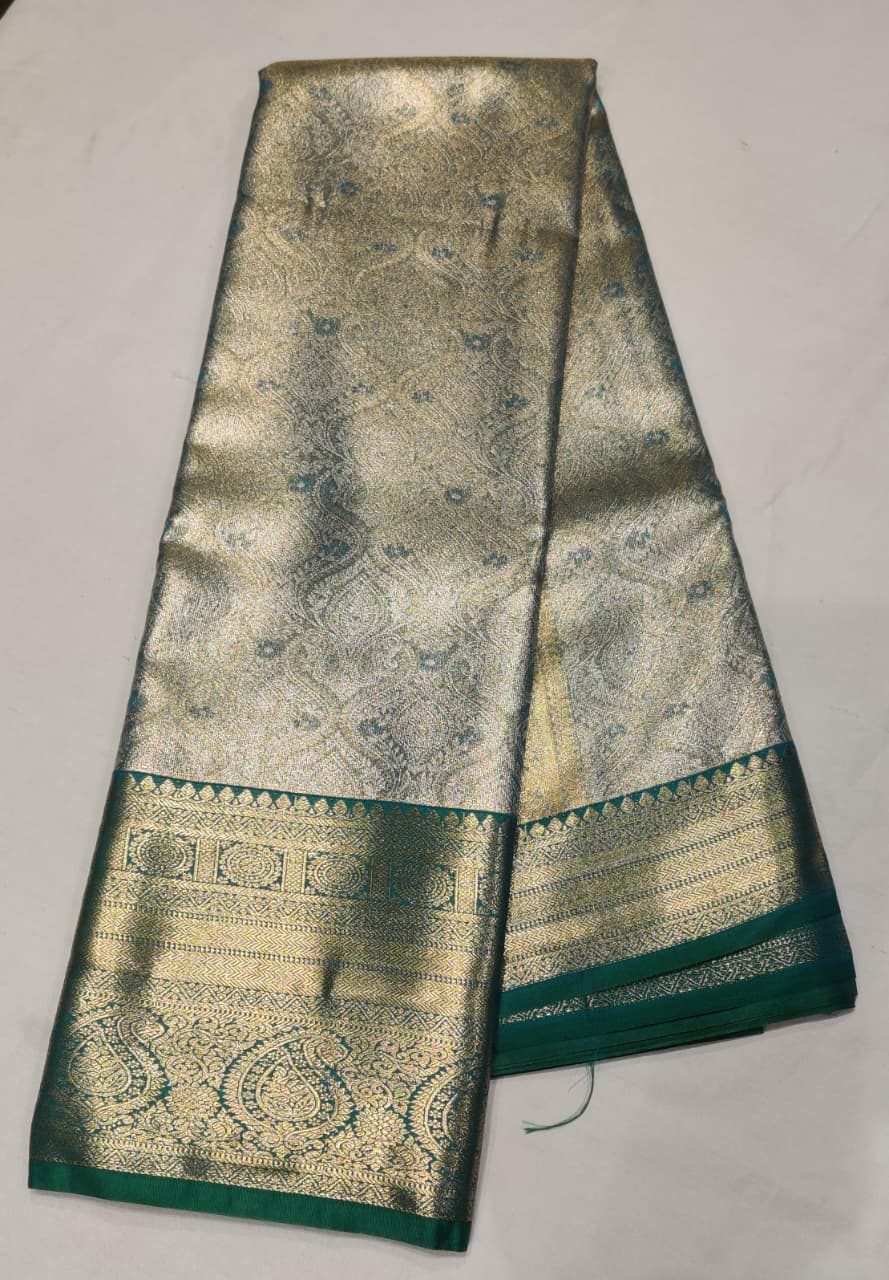 Step into timeless elegance with this Silver Green Silk Saree, a stunning masterpiece that beautifully blends tradition and luxury. The saree features a shimmering silver body with intricate floral and paisley zari motifs, complemented by a rich green border and pallu showcasing fine traditional weaving.
