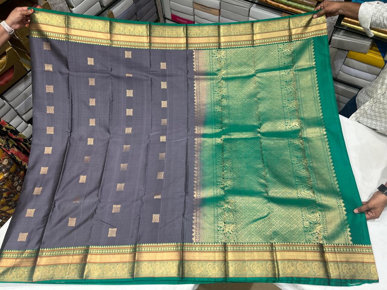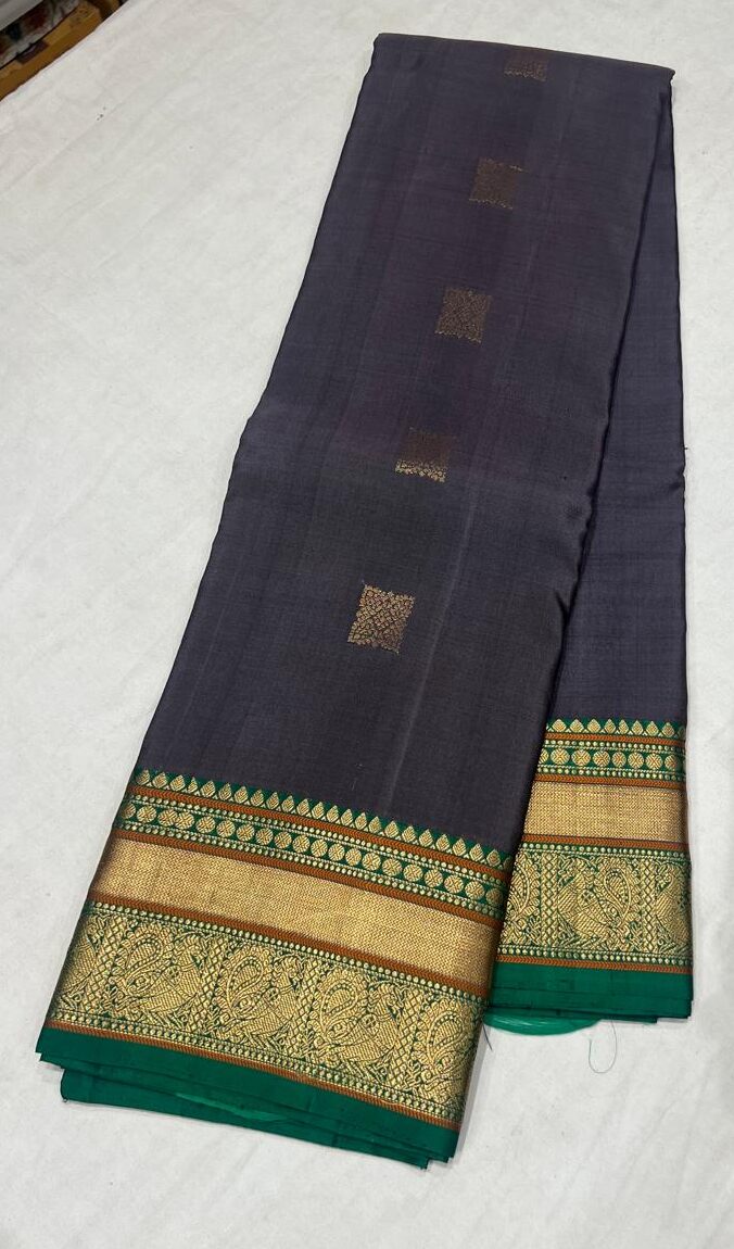 Exude timeless grace in this elegant Kanchipuram silk saree, featuring a sophisticated grey body adorned with delicate zari square buttas. The saree is beautifully complemented with a vibrant green pallu and a broad golden zari border, showcasing intricate weaving with traditional motifs.