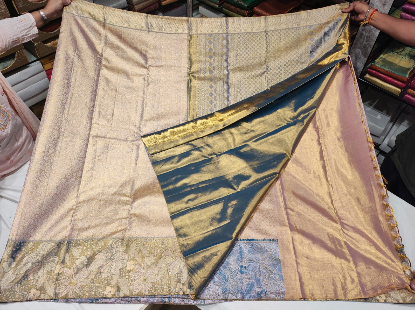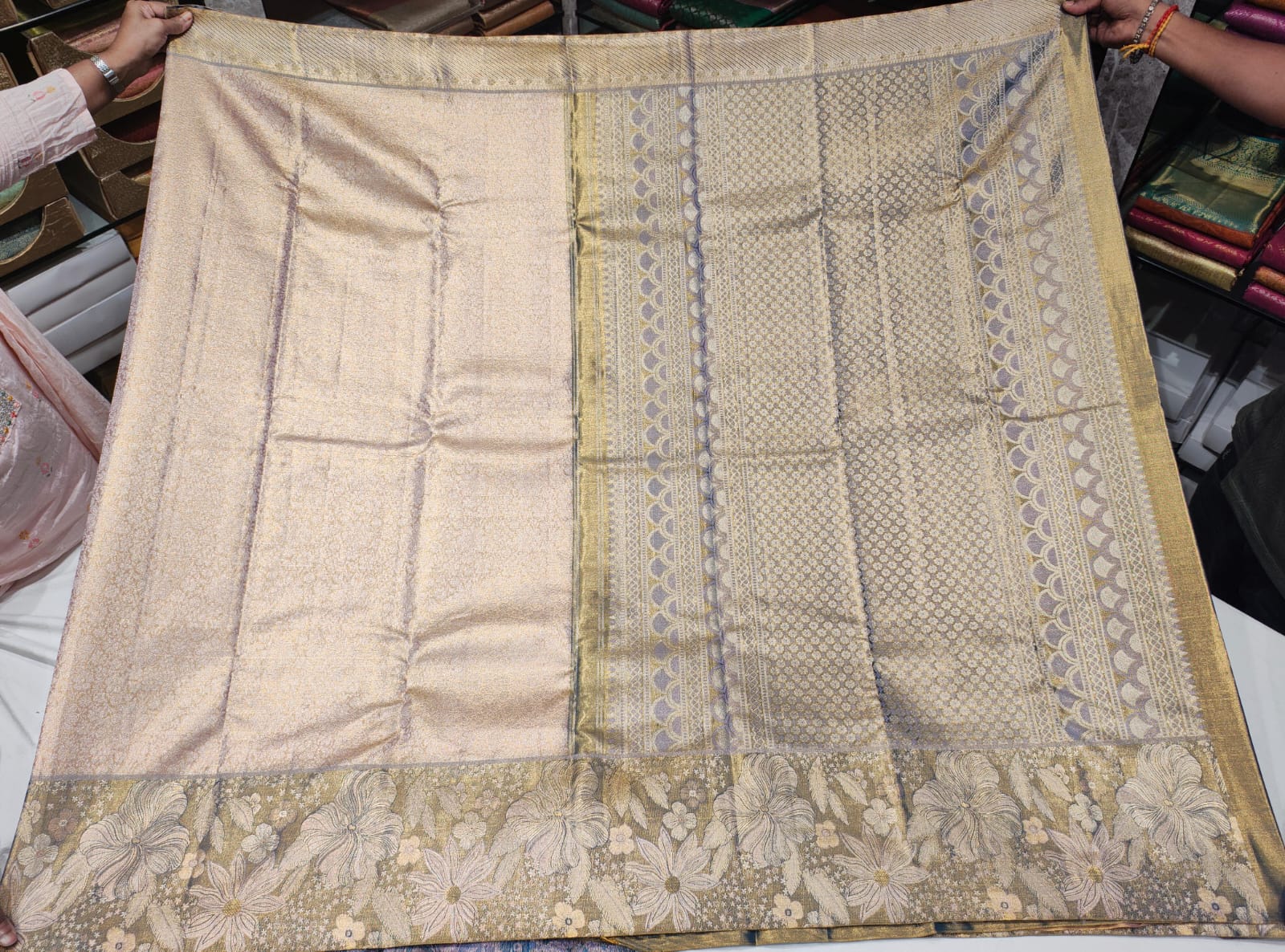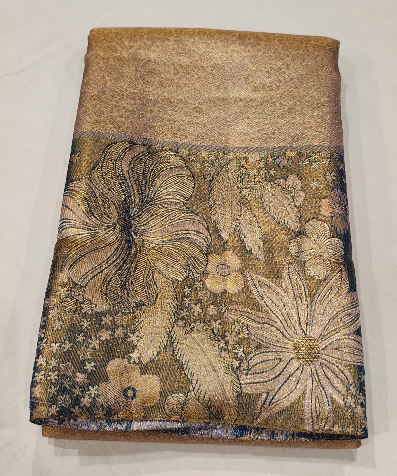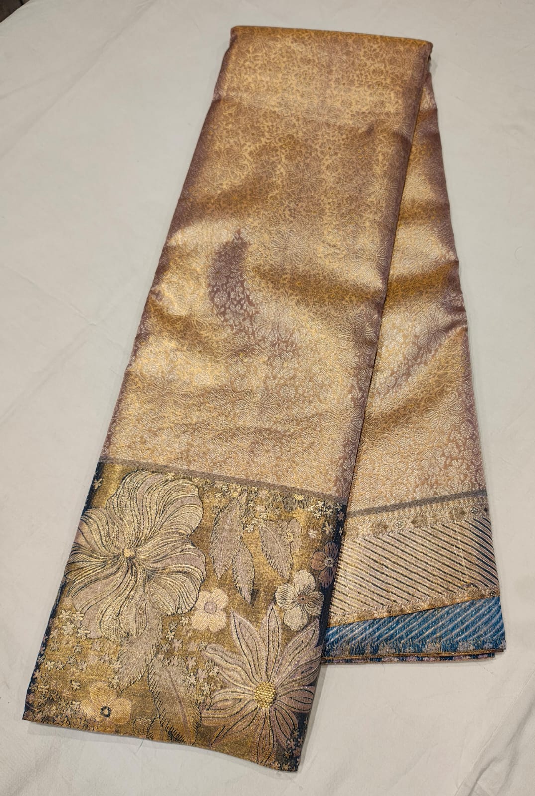 Step into elegance with this Kanchee Silk Saree, a perfect blend of traditional artistry and modern charm. The saree features a stunning floral zari weave all over the body, highlighted by a contrasting pallu with delicate metallic threads. Crafted with precision, its soft silk texture and rich golden-brown tone make it ideal for weddings, festive celebrations, and grand occasions.