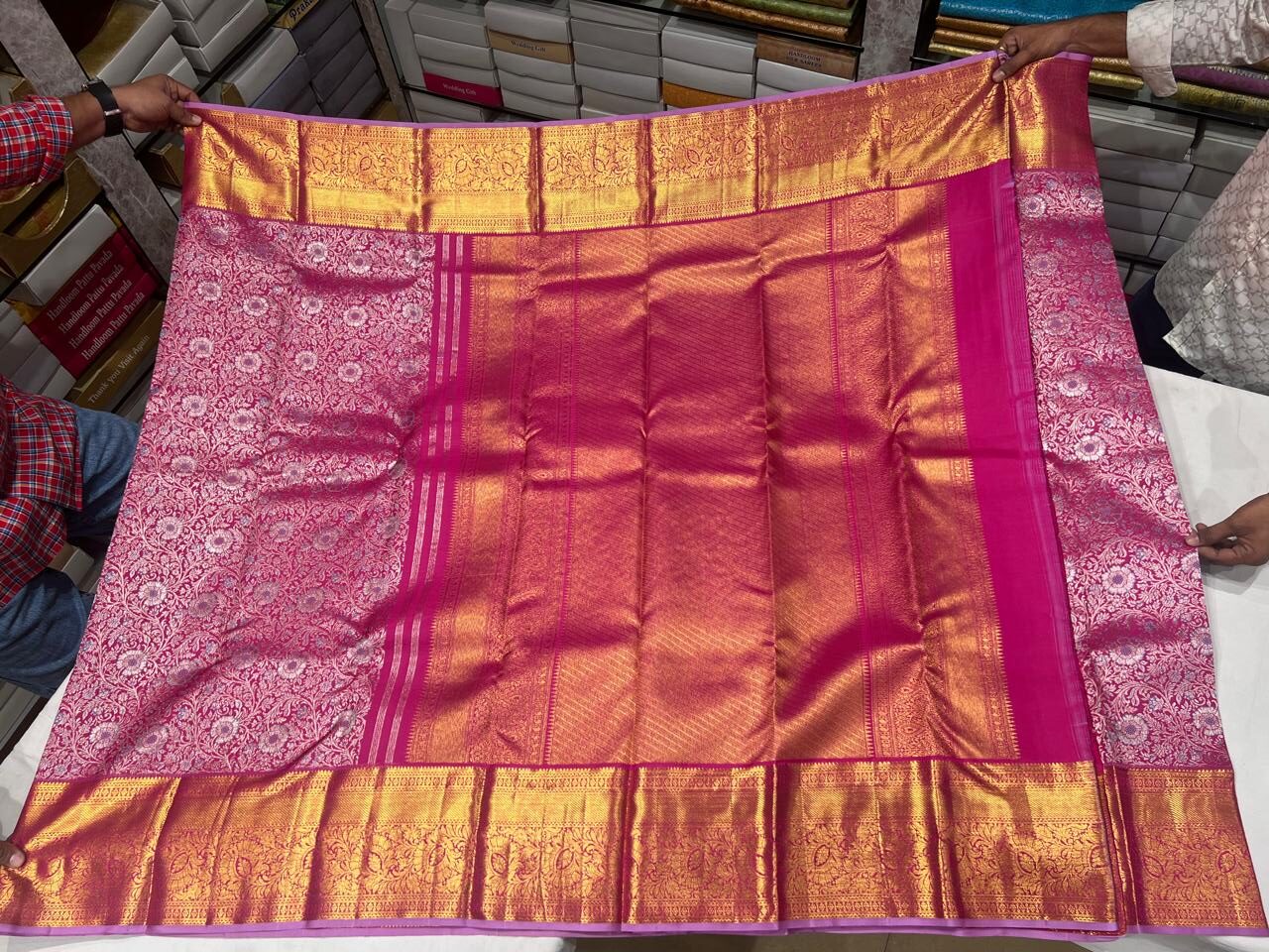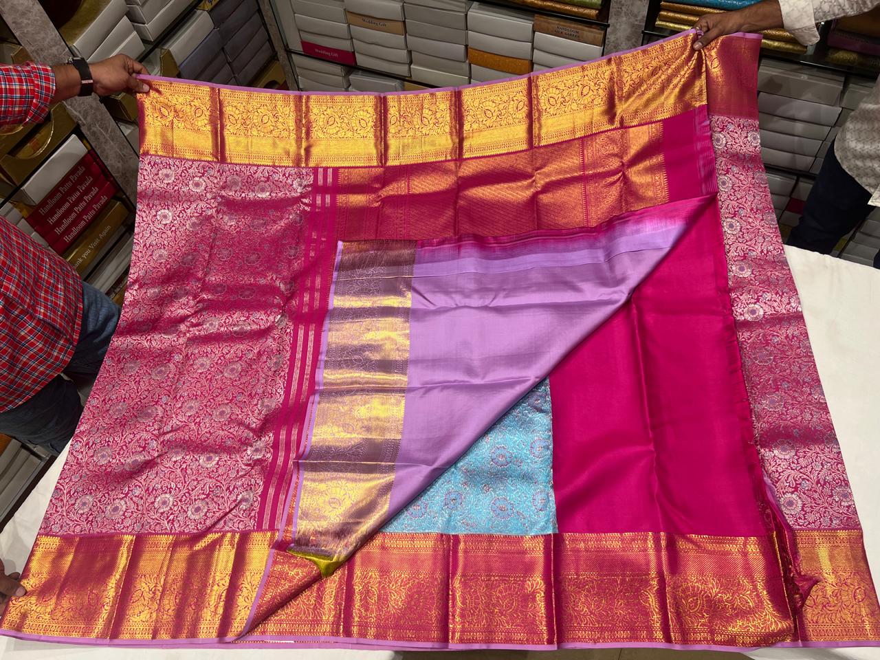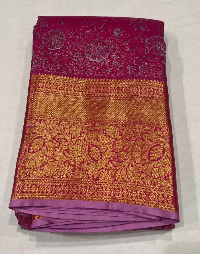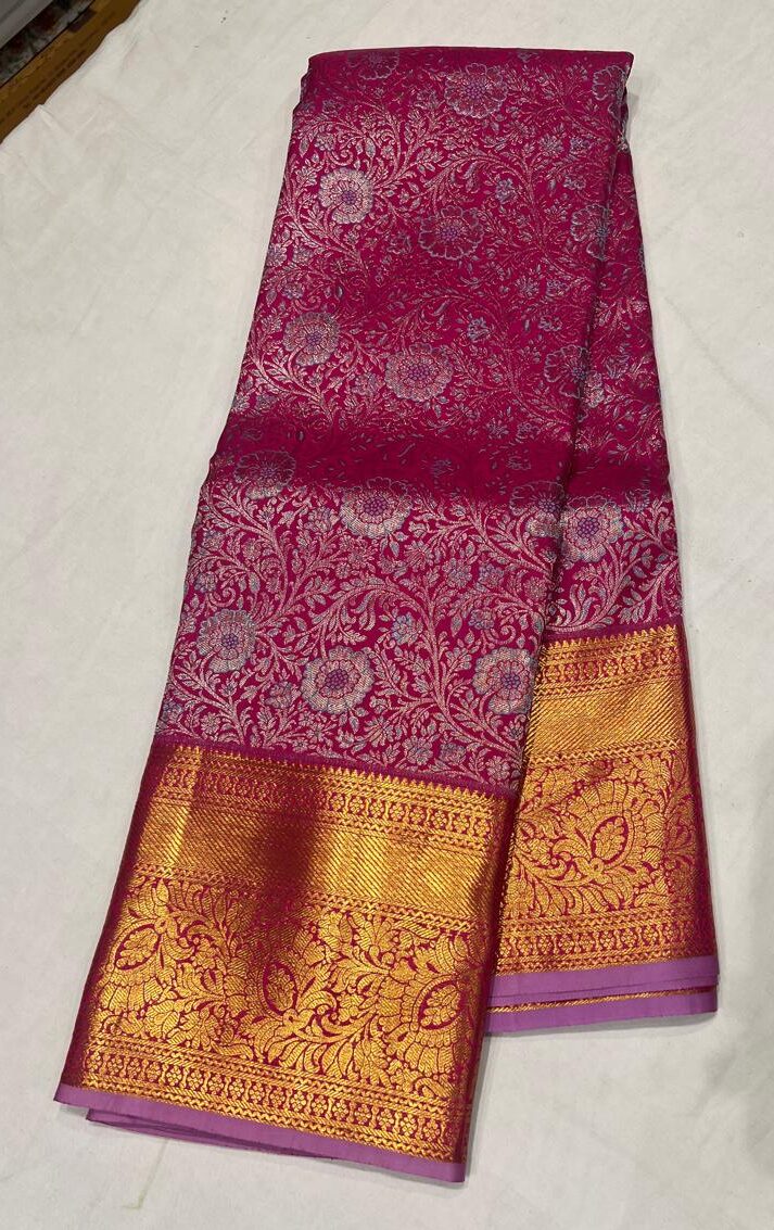 Step into timeless elegance with this pink Kanchipuram silk saree, beautifully adorned with silver zari floral motifs across the body. The saree features a broad golden zari border and a rich woven pallu that enhances its regal appeal.