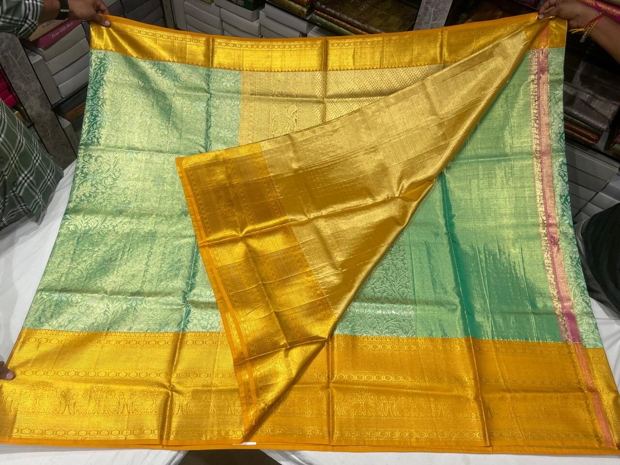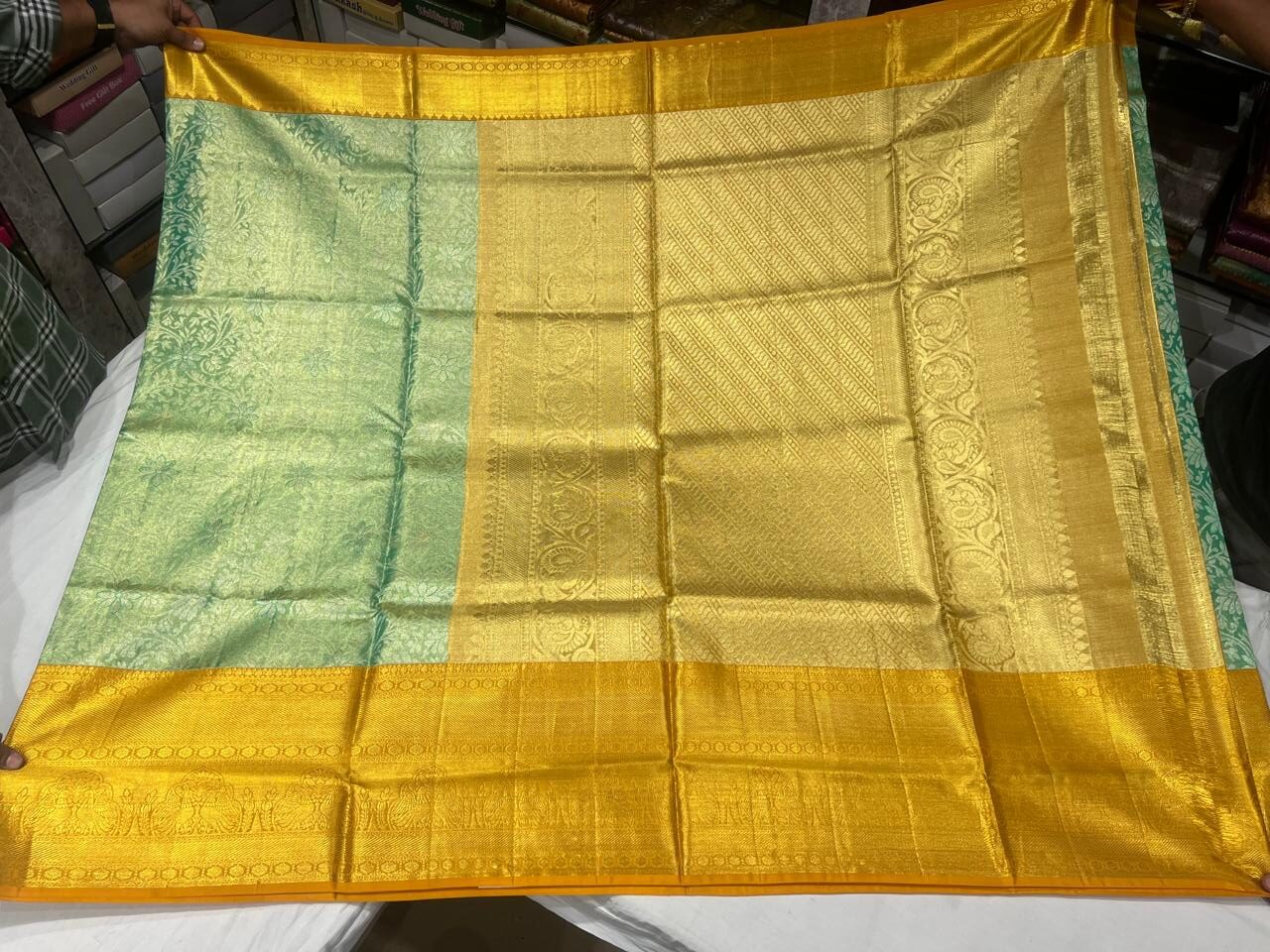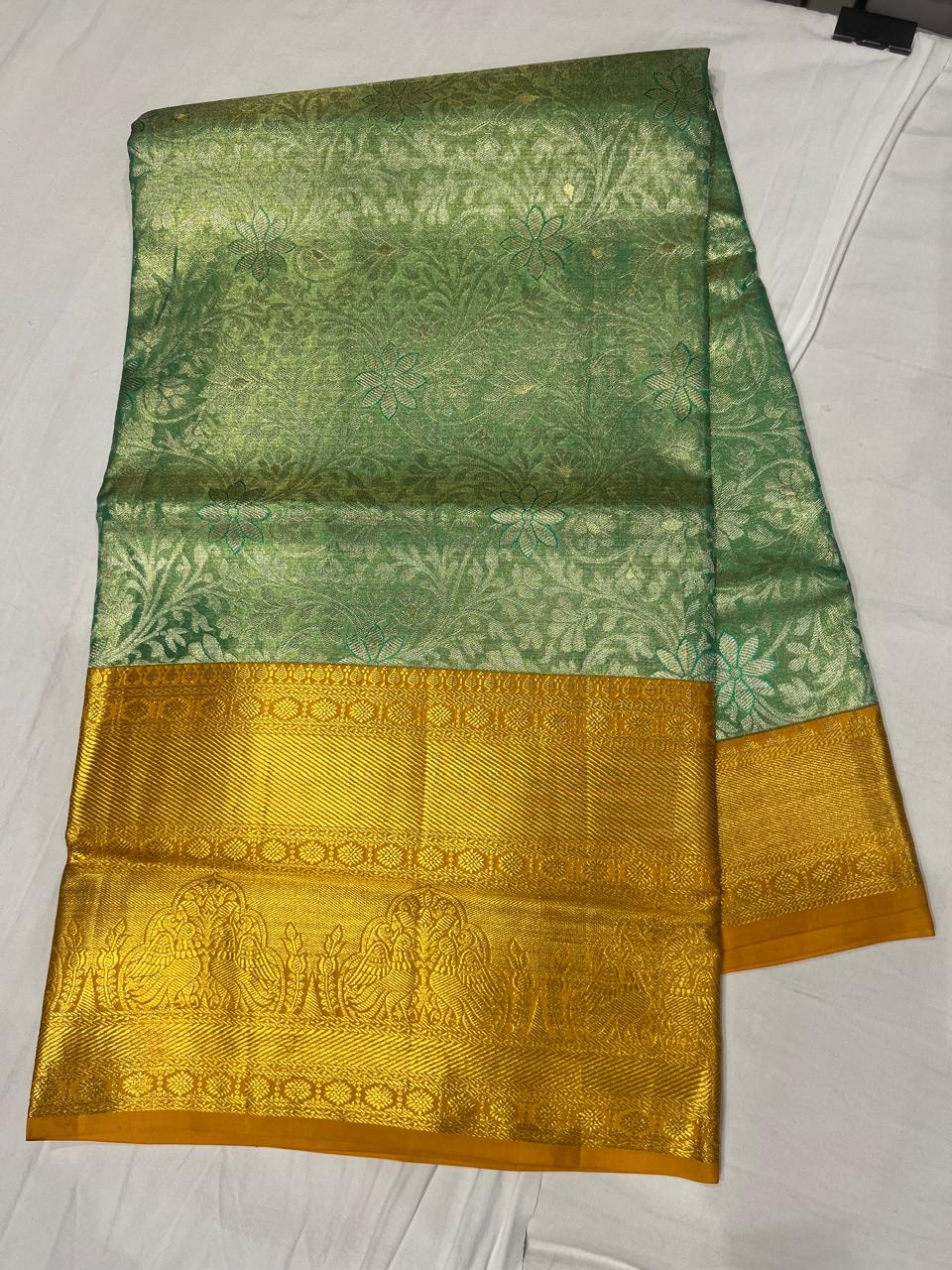Description: Elevate your ethnic wardrobe with this stunning Pista Green Kanchipuram Silk Saree featuring a gorgeous gold zari border. Crafted with intricate designs and traditional motifs, this saree is perfect for weddings, festivals, and special occasions. Made from high-quality silk, it offers a luxurious feel and a beautiful drape. The gold zari border adds a touch of elegance and sophistication, making it a must-have for any saree connoisseur. Pair it with traditional jewellery for a complete look.