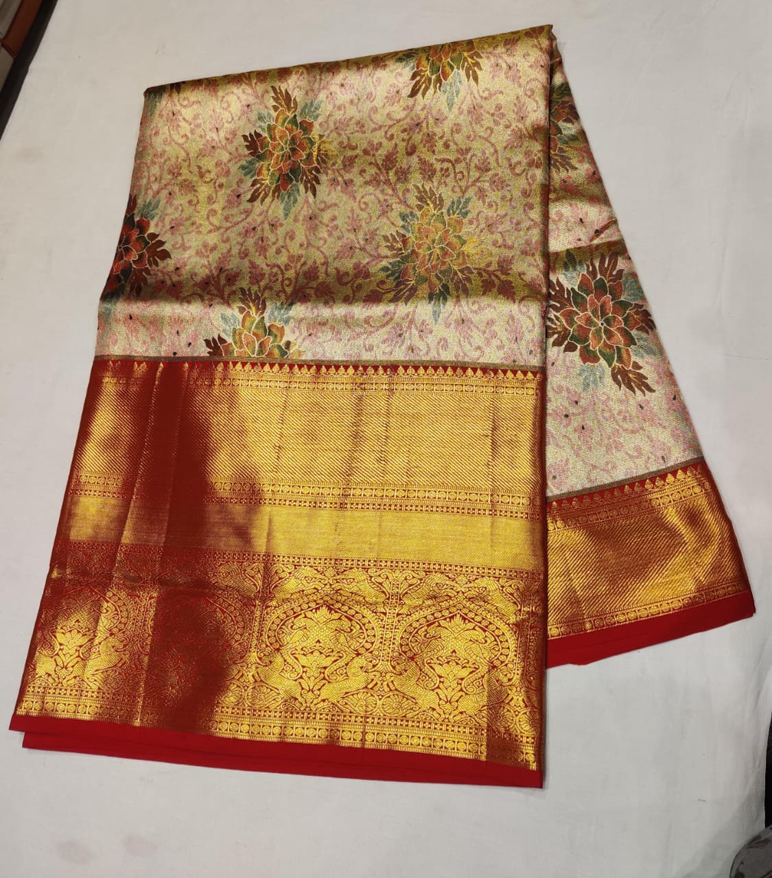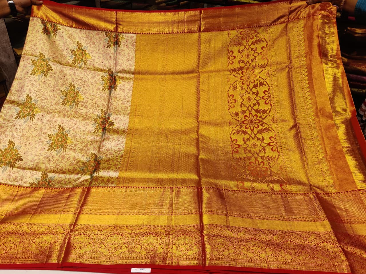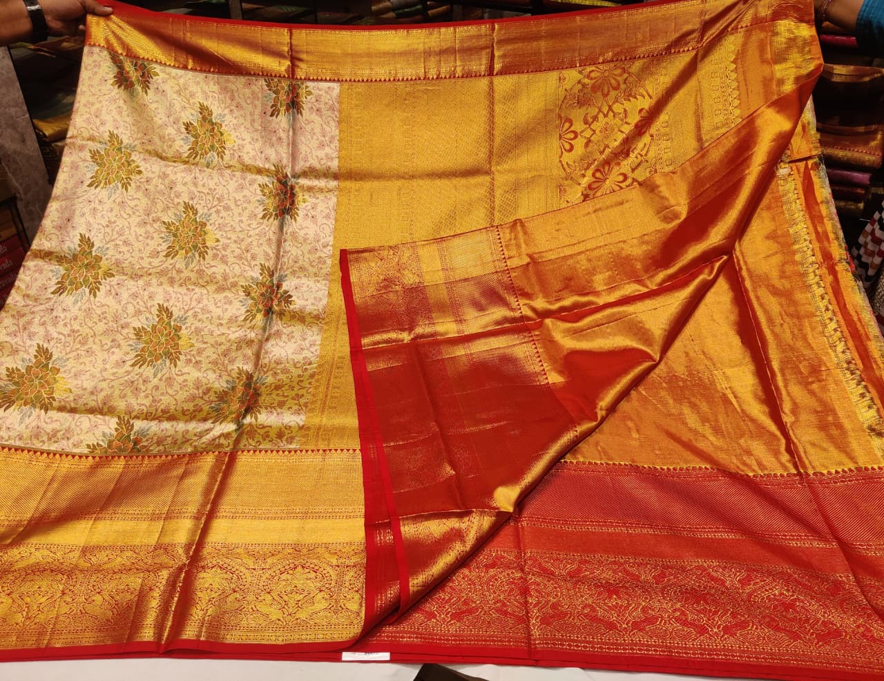 Unveil the grandeur of this classic Red and Gold Kanjivaram Silk Saree. This piece, often chosen as a Wedding Saree, is woven from rich Pure Pattu Silk in a deep Red hue. The entire garment is covered in a dense, intricate Gold Zari Brocade weave, ensuring a magnificent, luxurious drape.