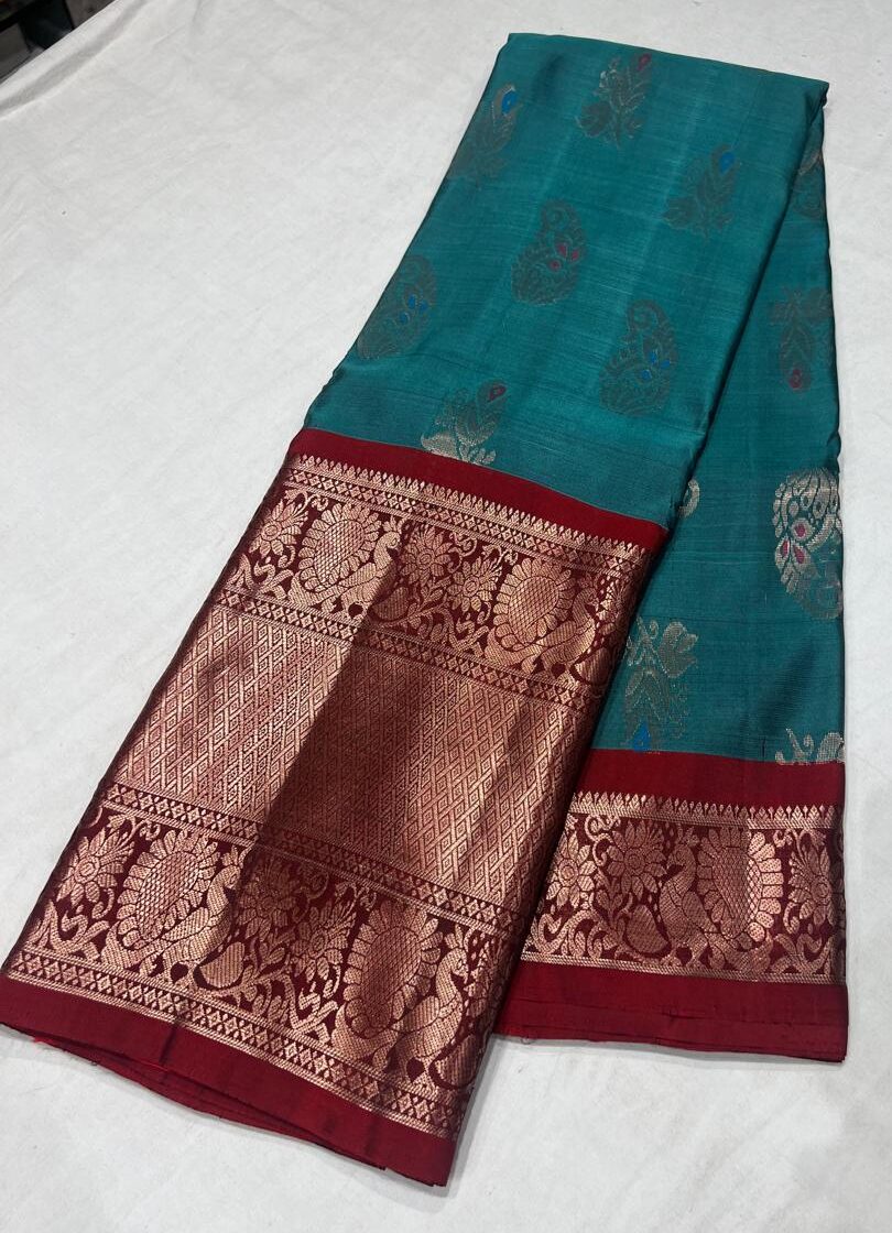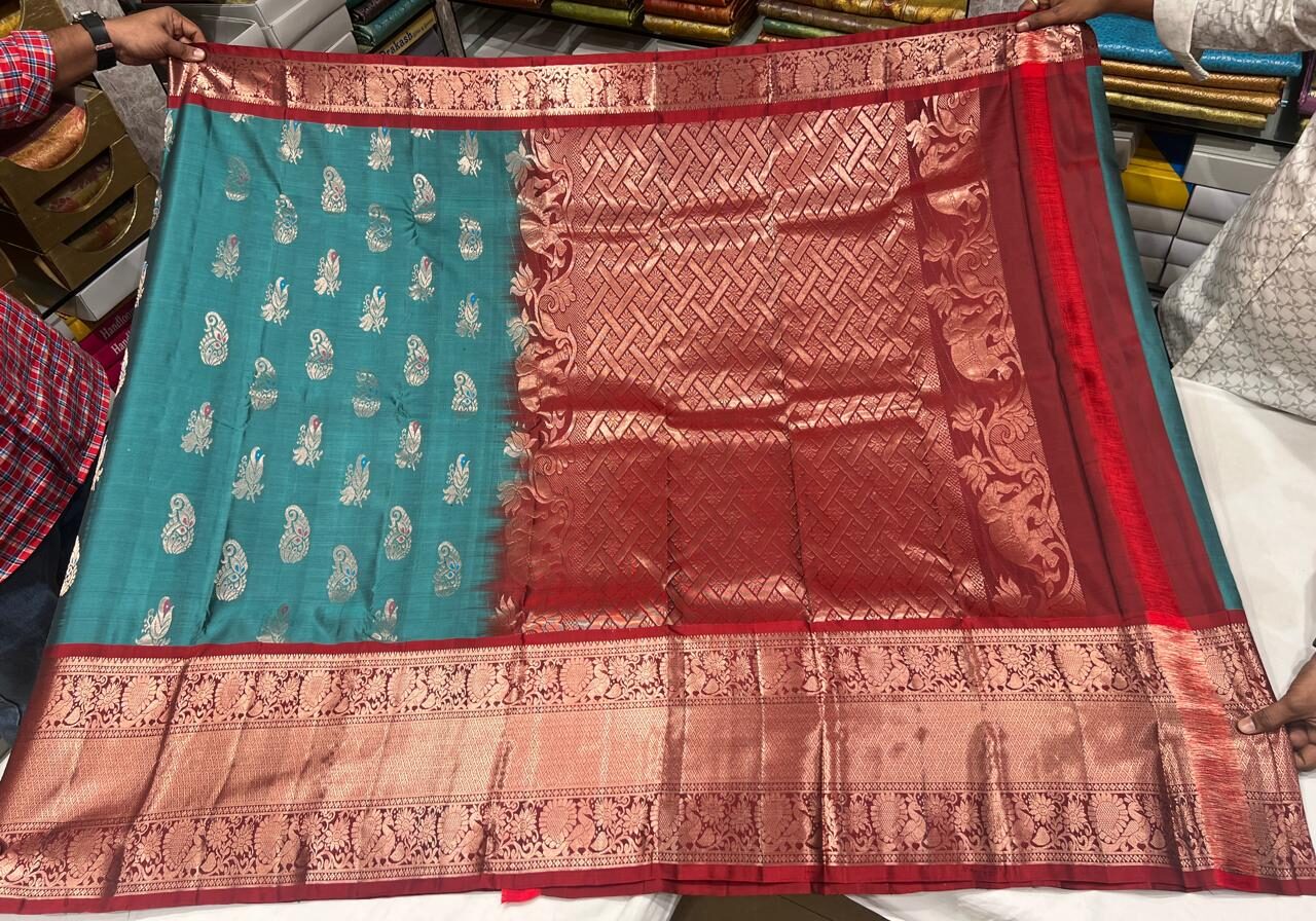Bring home the elegance of tradition with this stunning Kanchipuram silk saree, crafted with a teal blue body highlighted with delicate zari paisley motifs. The contrast red border and grand zari pallu showcase intricate weaving with floral and geometric patterns, exuding a royal charm.