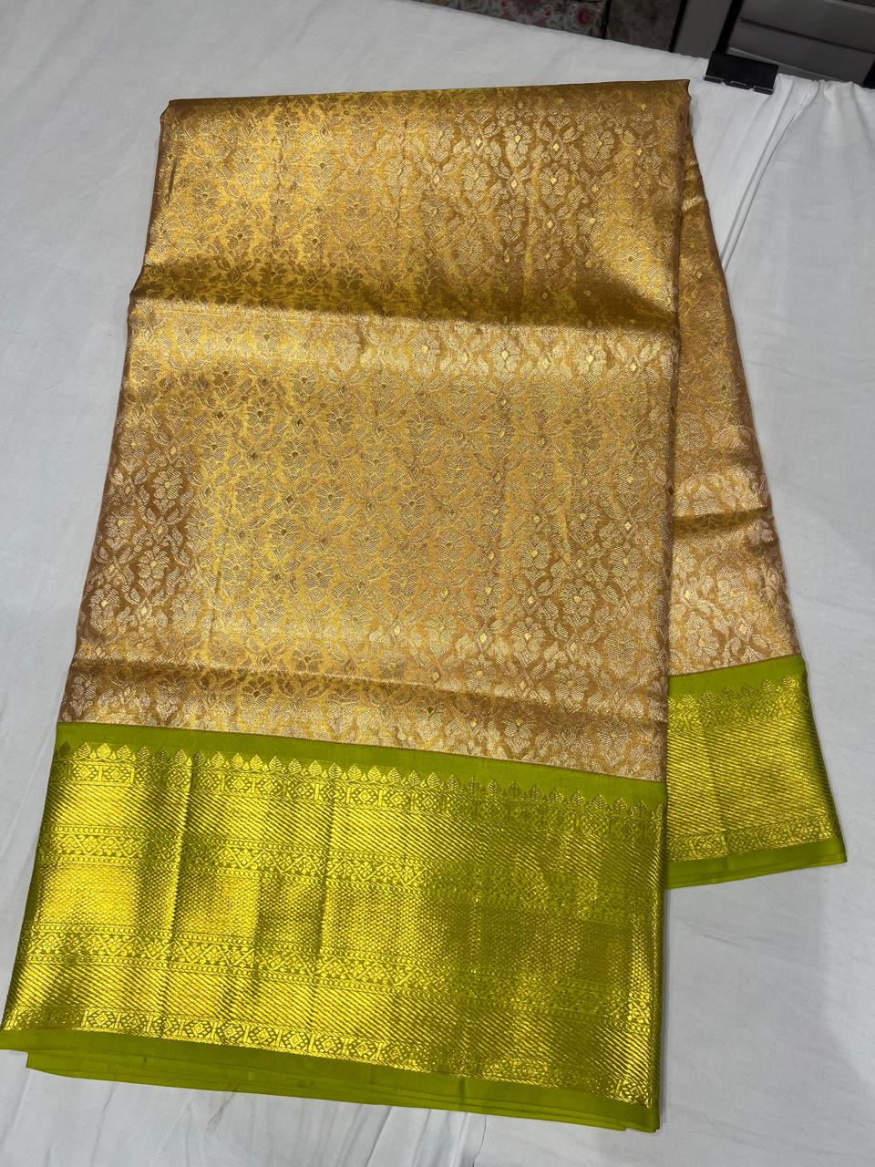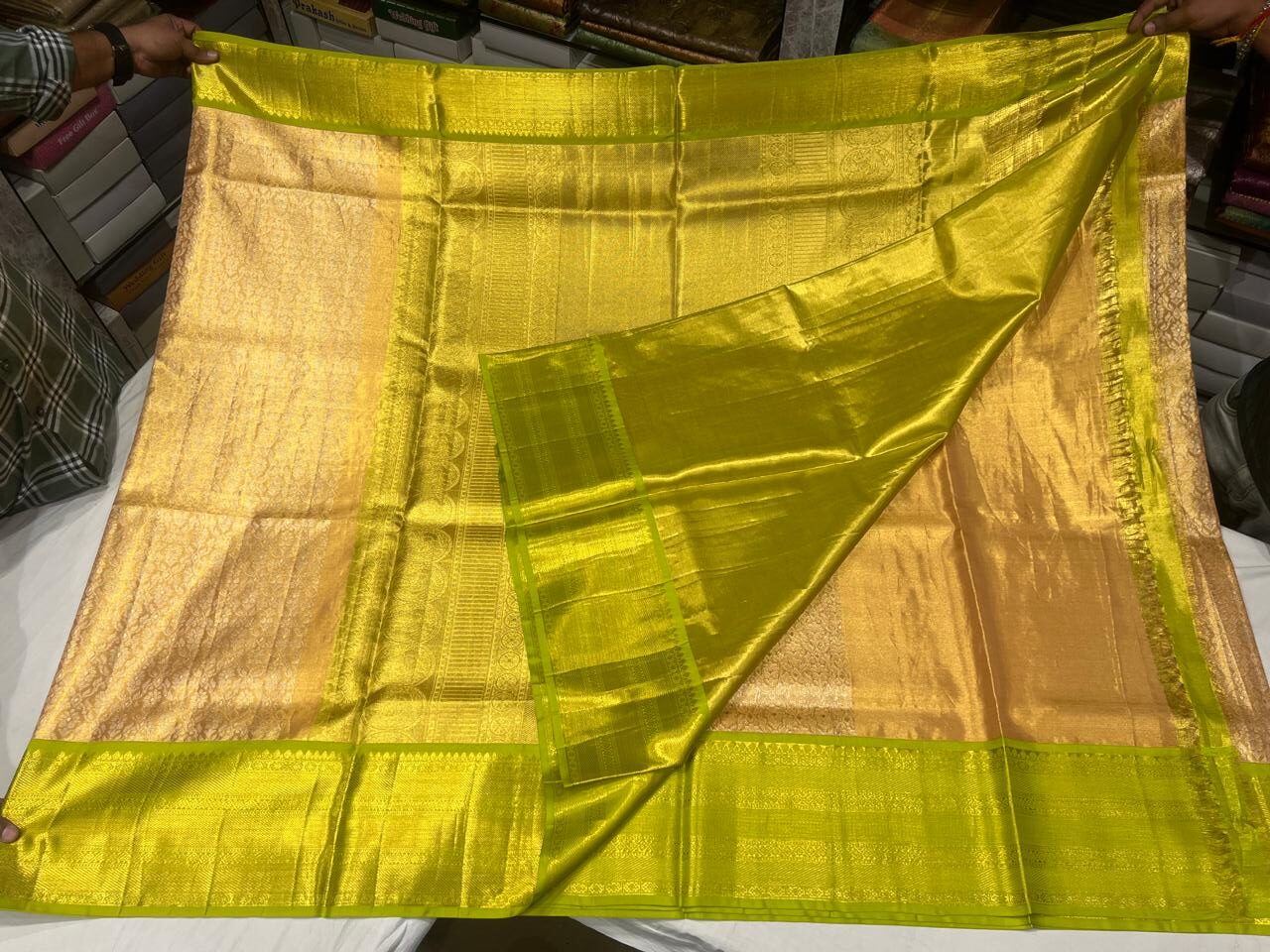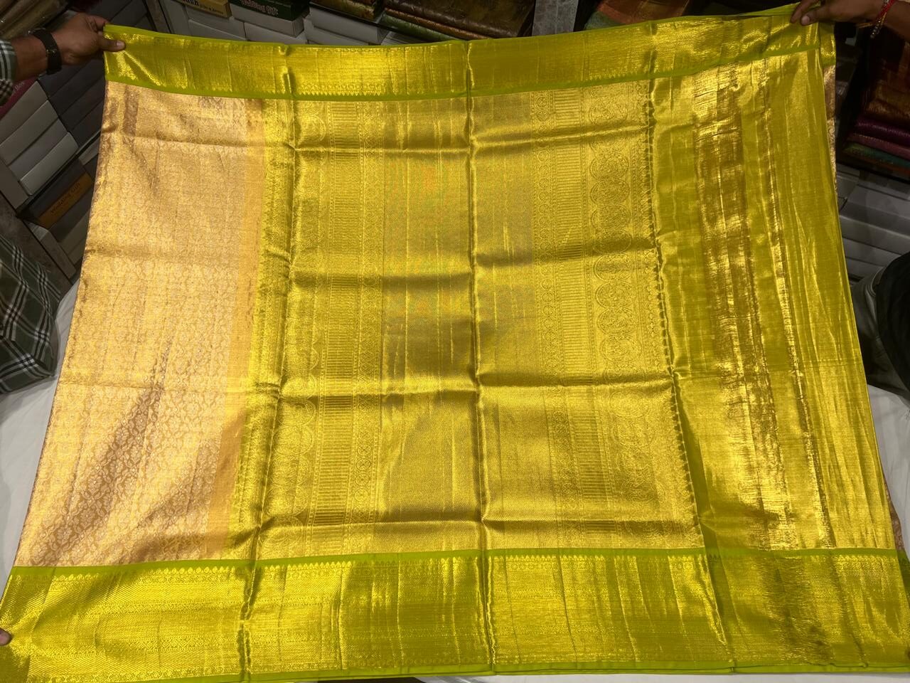 Wrap yourself in the timeless elegance of this Traditional Kanjivaram Style Silk Saree. The body of the saree features a luminous light gold (or pale yellow/beige) hue woven with subtle, self-design floral or geometric patterns. It’s beautifully contrasted by a striking Neon Green border and pallu that are richly woven with classic Zari work.